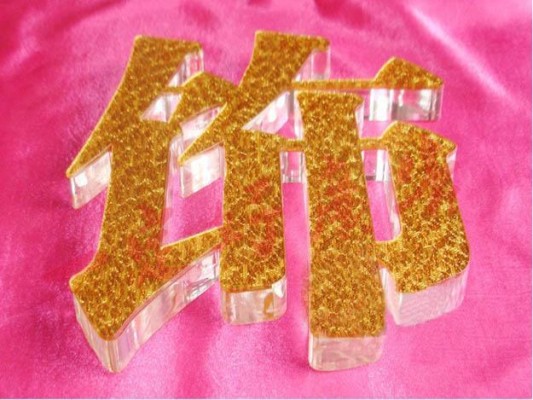 水晶字是用化學水將透明有機玻璃(亞克力)跟有色有機片粘合起來組合而成。成型時可以將透明有機玻璃和有色有機片分開來雕刻,也可先用化學水粘合后再一起雕刻。由燈光照射看起來非常好看,它可以用在室內和室外,不怕日曬雨淋。是一種性價比較高的高檔字。