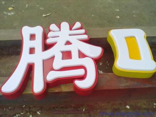 吸塑字由亞克力吸塑面、發光字箱體、及LED光源三部分組成:使用密度板,通過雕刻機將字形狀切割下來后,放于吸塑機平臺,將加熱軟化的亞克力板覆蓋于字形之上,板子四周與平臺用膠帶封住,使軟化的亞克力板完全吸附于密度板的字形,凸現字的形狀,冷卻后,將字輪廓裁切、裁邊,字面完成。